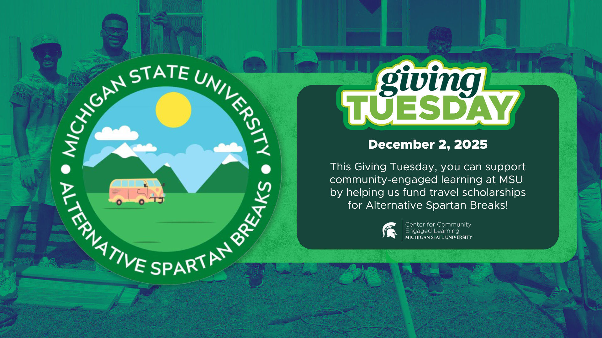 If you want to contribute to community-engaged learning at Michigan State University this Giving Tuesday, The Center for Community Engaged Learning is raising funds for the Don Ausman Alternative Break Endowment Fund, which provides scholarships for students participating in experiences organized by our Alternative Spartan Breaks (ASB) student organization! In memory of Spartan Don Ausman, this fund offers travel scholarships to students who wish to serve communities around the globe on their school breaks. Don, who passed away at age 22, gave freely of his time with communities in the United States, Africa, and Mexico. Help us keep Don’s spirit alive by supporting students who have the same commitment to community engagement.