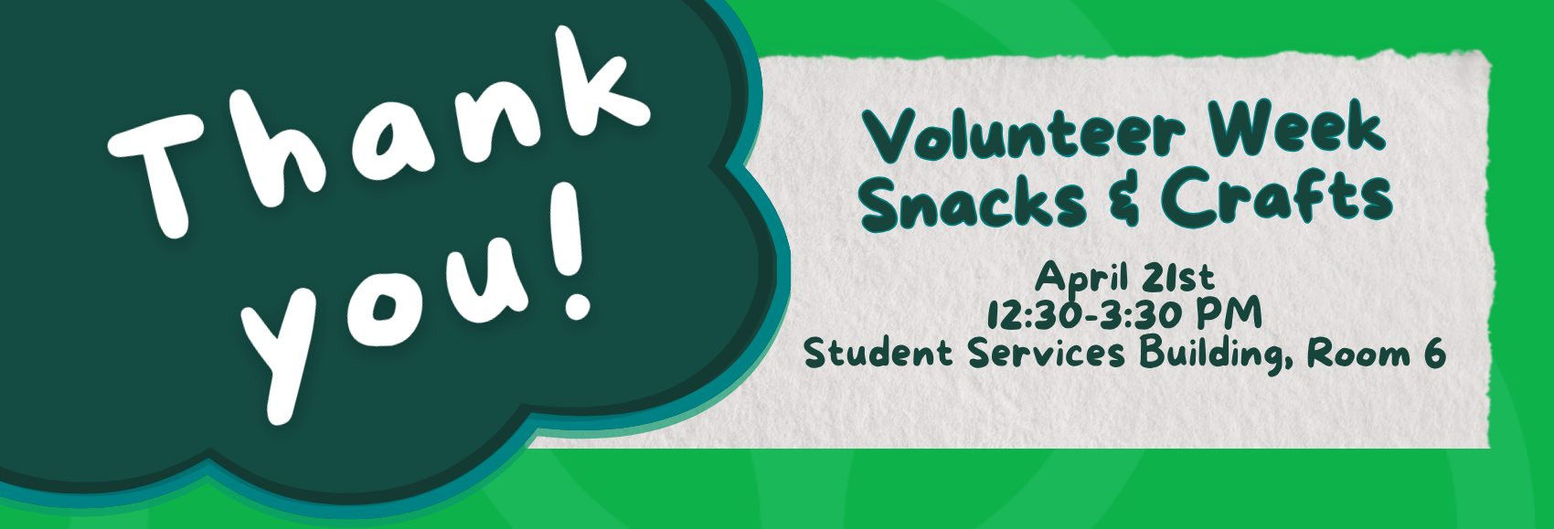 Calling all student volunteers! April 20th-26th is National Volunteer Week, and we’re grateful for your engagement this academic year! We invite you to Volunteer Week Snacks & Crafts in appreciation for the time you have committed to volunteering in the community. Join us for snacks, friendship bracelets, coloring, and connection with fellow volunteers!